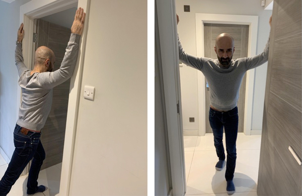 Doorway Stretch: Poor mobility of the rib cage, chest and mid-back can also contribute significantly to FHP and any accompanying neck pain. Foam rollers are excellent tools to mobilise these elements of the thorax, but you can get a great stretch of the chest by placing your forearms vertically on either side of a doorframe and gently pushing the chest through to stretch the front of the thorax. Again hold for 20-30 seconds and repeat three times. Again, never work through any painful movements.